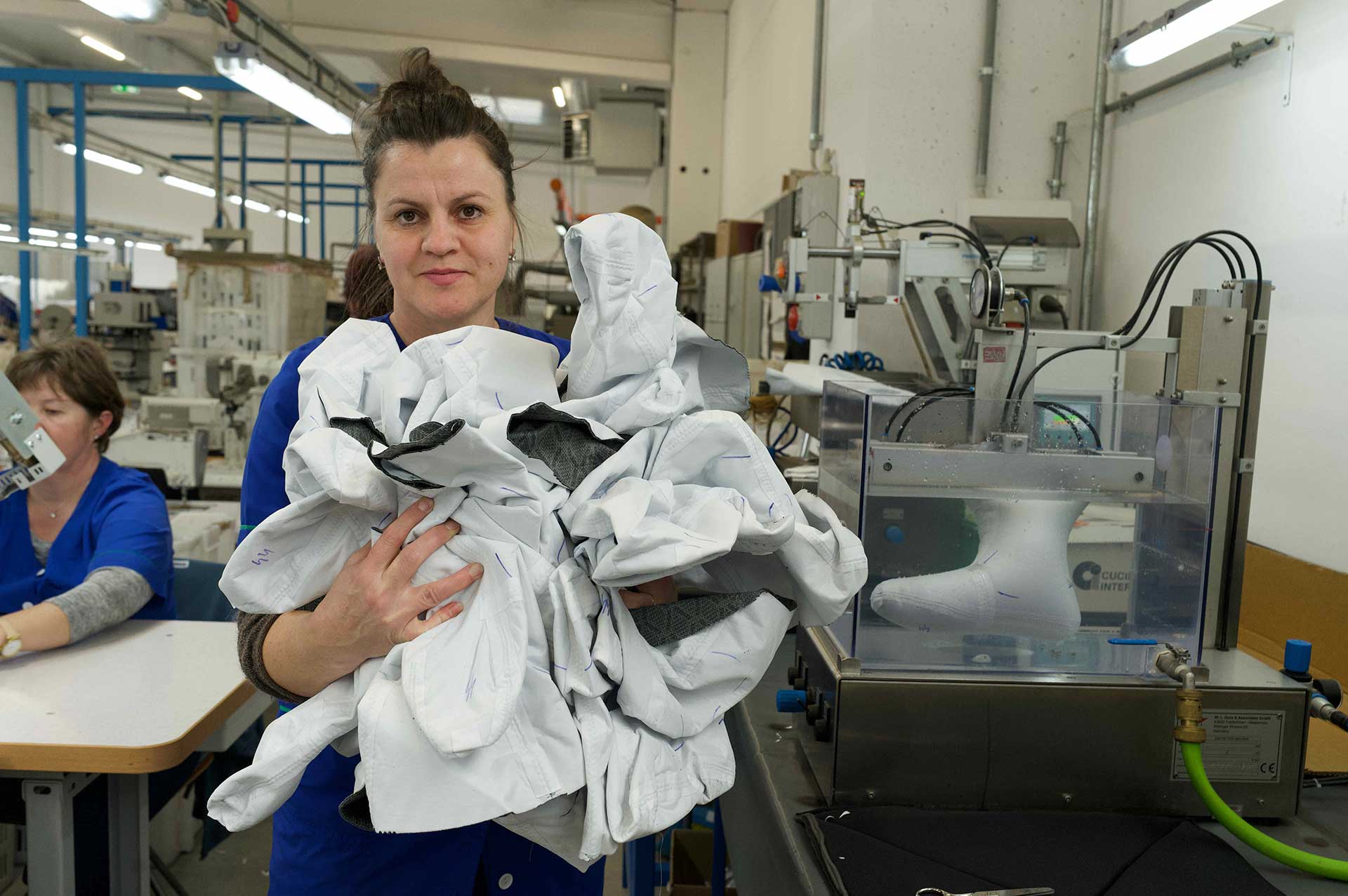 Folosim centrifuga pentru testele GORE-TEX®: scufundăm pantofii în apă în interiorul căptușelilor și îi centrifugăm timp de 30 de minute pentru a verifica dacă există scurgeri, asigurând astfel conformitatea cu standardele. În mod normal, testăm patru perechi la fiecare 30 de minute, pentru un total de aproximativ 24 de perechi de pantofi pe zi. Încălțămintea cu membrană GORE-TEX® este testată zilnic și, în funcție de cerințele specifice ale clienților, este supusă, de asemenea, testului Flex, care simulează mersul pe jos pentru a determina rezistența la flexie necesară, care variază între 100.000 și 200.000 de cicluri.